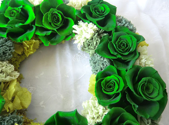 JUGEMテーマ:プリザーブドフラワー プリザーブドフラワーのグリーンのバラ。 生花にはない色ですね。 こちらはアモローサというプリザーブドフラワーのなかでは大輪のバラを使用しています。 肉厚の花びらで、ベルベットのような光沢があるのが特徴です(*´∀`*) もともと大きなバラですが、花びらを一枚ずつ外して、さらに開花したので ボリューム感は相当なものです笑 グリーン系のカーネーションとあわせて、グリーン仕上がりのリースがかんせいです...
