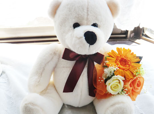 JUGEMテーマ:プリザーブドフラワー 真っ白いくまちゃんのぬいぐるみに ビタミンカラーのプリザーブドフラワーの花束を持たせた フラワーギフトはお誕生日のお祝い用にも ご結婚のぬいぐるみ電報にも会社の同僚の退職祝いにも おすすめです。もちろんご出産のお祝いにも… プリザーブドフラワーのオレンジのガーベラはみているだけで 元気になりますね〜 プリザーブドフラワーのかすみ草がふんわりと優しい雰囲気にしてくれます。 ホワイトベアとオレンジのミニブーケの組...