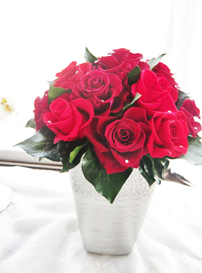 JUGEMテーマ:プリザーブドフラワー 退職のお祝いと60歳の還暦のお祝いを兼ねて 真っ赤なバラのプリザーブドフラワーギフトを お届けいたしました。 シルバーの花器に合わせるとスタイリッシュに。 プリザーブドフラワーの赤いバラはフロールエバー社の ワインレッドとチェリーレッドの2色を合わせました。 一輪ずつバラの花びらを開いて、ボリュームもだしています。 赤いバラのフラワーギフトは王道ですね〜 贅沢にバラを12輪使っているので合わせる副材はシンプルにアイビーリ...