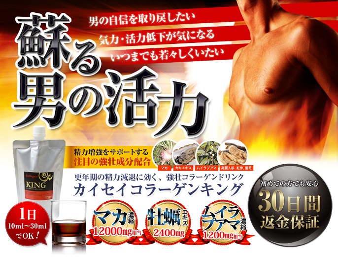 JUGEMテーマ:男性用サプリ(精力剤等)・グッズの情報 新発想!!マカ12000を末端までグングン送る活力系ドリンク【カイセイコラーゲン キング】 株式会社カイセイ堂 634-0803 奈良県 橿原市 上品寺町 7-6 南 育宏 40代、50代、60代の方 こんなお悩みございませんか? 活力に自信がなくなってきた。 年齢を感じはじめている。 パワーを感じないことがある、 いつまでも若々しくいたい。 これらのお悩みをもっている方々へ 蘇る活力! 精力減退に有効な成分を一杯に ギュッと凝縮しています。 特に更年期以降の...