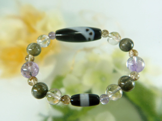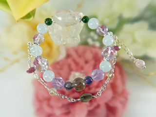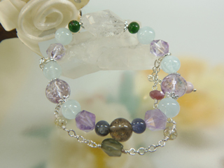 JUGEMテーマ:天然石 クリスタル パワーストーン ホランダイト鉱インクォーツとクロムダイオプサイト アクアマリン・アメジスト・アメトリン・アイオライト で構成されたブレスレットです。 長いことモリオンマザーの自宅兼アトリエにいらしてくださる VIPなお客様です。 土曜日の午後紅茶を飲みながら結構優雅なひと時をすごしました。 一目見て気に入って腕にはめたところぶちっと 連結のゴムが切れました。 初めてのことです。「何で」と思いました。 はじけて飛んだストーンを集めたの...