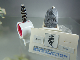 JUGEMテーマ:天然石 クリスタル パワーストーン 不動明王(ふどうみょうおう)密教では、五人の明王が いまして、そのトップというか中心にいます。 右手に剣左手に縄を持つ姿として、仏道の教えに外れると 縄で引きずって正道に戻すといいます。 右がその不動明王が彫刻されたペンダントヘッドです。 テラヘルツを素材にしております。 不動明王は、酉年生まれの方の守護尊で、梵字は 「カーン」瑪瑙に梵字カーを描いた天珠です。 裏には、天をあらわす○が描かれてあります。 梵天の...