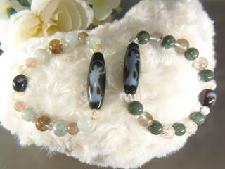 JUGEMテーマ:天然石 クリスタル パワーストーン モリオンマザーのところには、弁財天天珠のブレス が二点ほどございます。 左がモルガナイトとか色合いが女性らしいもので、 右がグリーンの翡翠と庭園水晶の鉱物が内包された ワイルドな男性用のブレスレットです。 女性用のものは、取り合わせたストーンがモルガナイト とか3月の誕生石でもあるアクアマリンと金鉱石が花 のように広がったフラワールチルです。 メンズようのほうは、表は弁財天天珠なのですが、 裏には大黒...