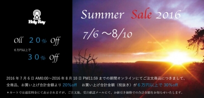 JUGEMテーマ:天然石 クリスタル パワーストーン Holy Ray ミネラルズショップでは、2016年サマーセールを開催しています。 期間は、2016年7月6日〜8月10日 pm11:59までのオンラインでのご注文が対象です。 全商品、お買い上げ合計金額より20%off 6万円以上(税抜き)お買い上げで30%offとなっております。 カートでは、通常料金にて表示されますが、ご注文後、ご注文確認メールにてお値引き後の金額をお知らせいたします。 SaIeは不定期での開催です。ぜひこの機会...