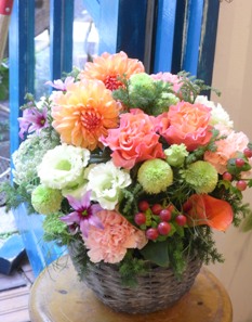 70歳のお誕生日を迎えるお母さんに。オレンジのダリアを入れたアレンジメントを明石まで発送しました。「おめでとう!!」お祝い気持ちが届いてるといいなー。harukina facebook