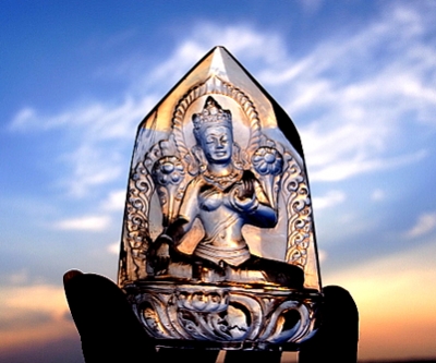 夕焼けに空が染まり、、、 どこかとても遠い所に繋がりそうで、 届いたばかりのヒマラヤ水晶彫刻を持って、 外に出ました。 グリーンターラ母神。 ラリターサナ、、、 片足を前に出した遊戯座で座るこのお姿は、 今、すぐにあなたの元へ行きます。 と、立ちあがろうとする姿です。 ヒマラヤ水晶仏陀。 眉間から頭頂に響いてきそうな、、、 とてもクリアな水晶に彫られています。 そして、立姿のサラスバティ。 静かな心...