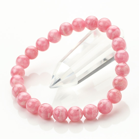 ロードクロサイトのブレスレットでございます。ロードクロサイトの中でも、いちごミルクのような色合いが特徴です。黒い点などや、まん丸になりきれていない玉もございますが、数ミリ単位のものでございますので気になさらずお使いいただけるかと思います。白い部分とピンクの部分のコントラストピンク色に深みがあり、程よいマーブルカラーが美しく、玉の艶も抜群ですのでお勧めでございます。 『約8ミリ ロードクロサイト ブレスレット』 32,400円(税込)