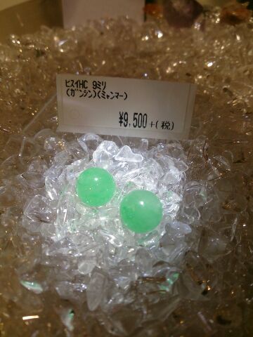 JUGEMテーマ:パワーストーンJUGEMテーマ:縁起物JUGEMテーマ:天然石ビーズJUGEMテーマ:天然石アクセサリーJUGEMテーマ:天然石・原石・ルースおはようございます昨日の中門さんのコメントにもありましたが朝晩の寒さとは関係なく食欲旺盛で体型気にしなきゃいけないのにどんどん体がお金持ちになっている店長です。食べられるって素晴らしい〜☆さてさて、食欲はさておき、思わず手が伸びる物欲にかられてしまう美しいヒスイが入荷いたしました〜ヒスイ¥9500+税宝飾品としての処理加工がされており、何とも透き通る美しい緑色で...