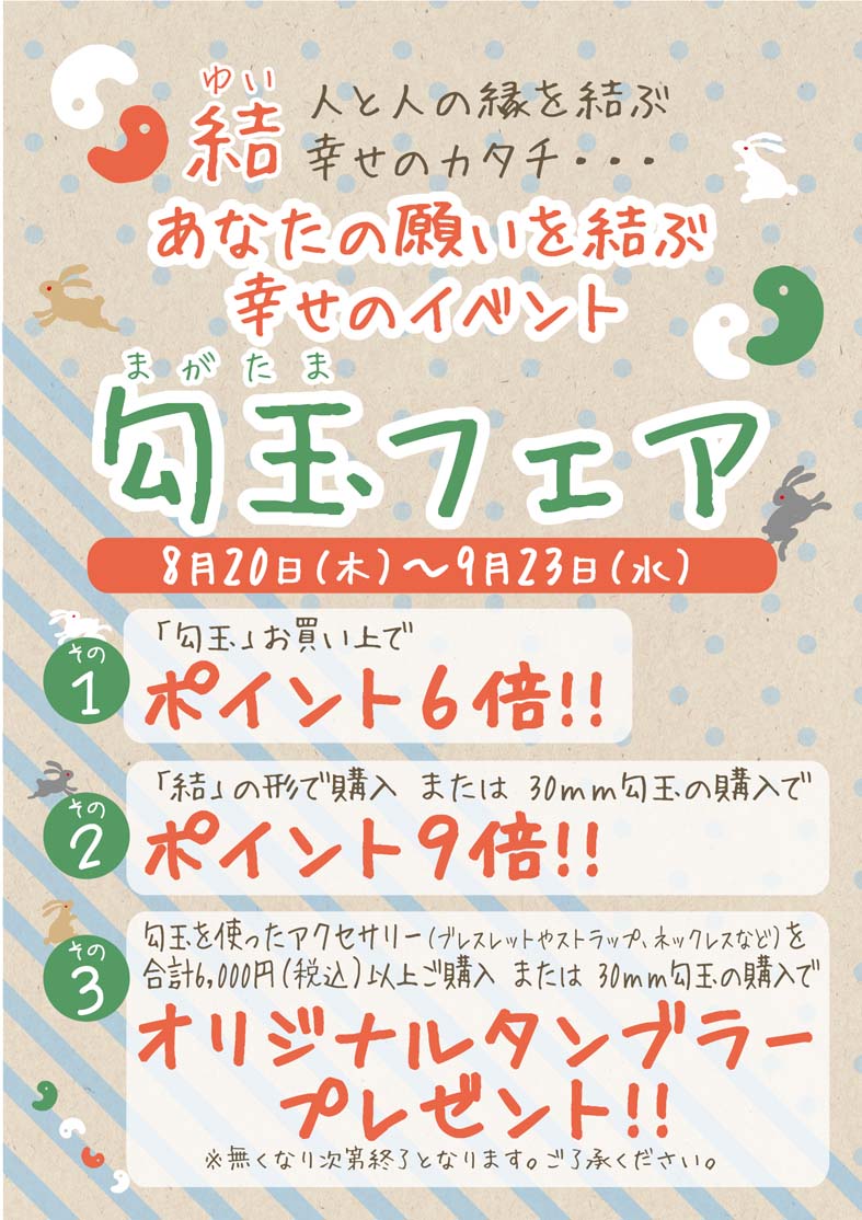 JUGEMテーマ:パワーストーンJUGEMテーマ:天然石アクセサリーJUGEMテーマ:天然石・原石・ルースJUGEMテーマ:開運・幸運について 勾玉フェア 特典? 勾玉お買い上げでポイント6倍 特典? 「結」の形で購入、30ミリ勾玉の購入でポイント9倍 特典? 税込6,000円以上の購入または、30ミリ勾玉の購入で めのやオリジナルタンブラープレゼント期間:8月20日〜9月23日までどうぞお見逃しなく♪♪皆さまこんにちは本日は阿部が担当いたします早いものでもう9月ですねいやぁ〜〜本...