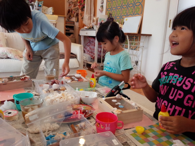 JUGEMテーマ:手作り/ハンドメイド雑貨 JUGEMテーマ:アートワークショップ JUGEMテーマ:天然石アクセサリー こんにちは、(^^)/ 先週、26日(土)が最後のワークショップでした、 4日間すべてのワークショップが終了いたしました! 沢山のお子様方に、夏休み工作の貝殻小物ケース&リース&レジン を作ってくださり。無事に終了いたしました! 沢山のご参加ありがとうございます(^^)/ まあ、来年も会える事楽しみにしております〜(^^)/ 様子の写真です☆