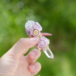 JUGEMテーマ:天然石アクセサリー こんにちは^^ 本日1つ目のご紹介です。 桃の天使と名付けました。 ・全体の長さ…7.9cm ・クラック水晶の大きさ…2cm ・ポイント部分の長さ…見える部分で2.5cm ・飾りと致しまして、ローズクォーツ8mm、ラベンダーカルセドニー4mm、ホワイトアゲート3mm、 水晶4mm、アラゴナイト6mm、イタリア製聖母マリアメダイパーツを使用致しております。 写真には写しておりま...