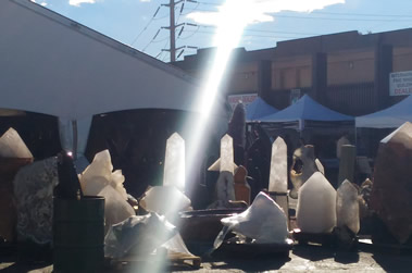 JUGEMテーマ:パワーストーン JUGEMテーマ:天然石アクセサリー 数日前から、アリゾナ州のツーソンミネラルショーに来ております。 晴天に恵まれ、あちらこちらの会場を、元気に歩き回りながら。 屋外の会場も多いので、 青空から、 まるでレーザー光線のように地上に降りてくる太陽の光と、 巨大な水晶。 太陽と青空と石。 この三つが揃うと、私は何故かスイッチがオンになり。 それまでは、真面目にああしよう、こうしよう...