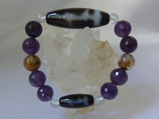 JUGEMテーマ:天然石アクセサリー 観音様が瑪瑙に描かれた天珠です。 裏表両方に描かれた天珠は、「双面観音天珠」とよばれ観音天珠の最高峰 とされています。 その双面観音天珠に、紫水晶と火花ルチルクォーツで、ブレスレットにしました。 紫水晶アメジストは、霊性が高く恋愛や対人関係にかかわる愛情の交流を深め、 時には大胆な行動で愛にまつわる運命を切り拓く力強いサポートとなってくれる ブレスレットです。 火花ルチルクォーツと呼ばれるタイチンフラワールチル ドルチルが水晶内に...