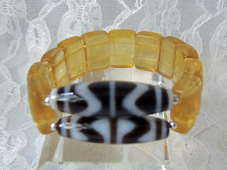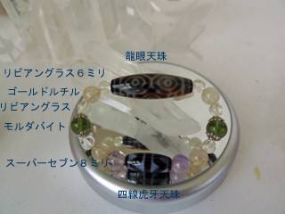 JUGEMテーマ:天然石アクセサリー 龍眼天珠(りゅうがんてんじゅ)と四線虎牙天珠の組み合わせは、 龍虎(りゅうこ)の取り合わせです。龍虎相喰むと言う諺から きています。武勇を誇る二者の対決に使われることが多いのですが、 東の守護神青龍と西の守護神白虎は、龍が陽の気をあらわし、 虎が陰の気をあらわすので、二つ出会うと陰陽の出会いとなり 相互の影響がバランスを取れたものであるように教示する風水から 来たものです。 こちらの天珠ブレスレットに使ったパワーストーンは、 リビアングラスとモルダバイ...
