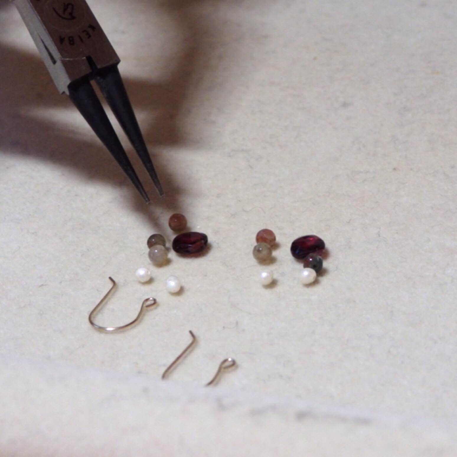 JUGEMテーマ:天然石アクセサリー こんにちは 本日もオーダーいただいております 1月のお誕生日プレゼント用にピアスを1点 せっかくなので誕生石(ガーネット)を使用します ガーネットは柘榴石ともよばれ、深みのあるワインレッドが人気のストーンです 個人的に赤が大好きなので、たびたびパーツにチョイスしています どんな色合いにしようか・・ ガーネットの色を際立たせるため、周りの石たちは落ち着いたトーンに パールもつやの無いケシパールをチョイスしました アクセントに短めのチェーンを ノーマルな小...