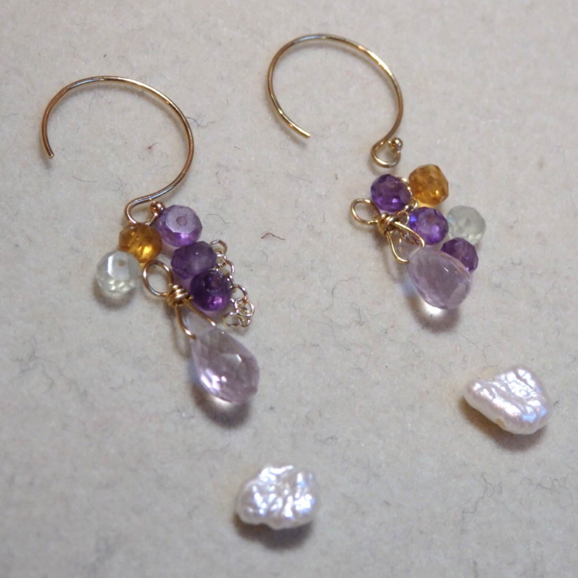 JUGEMテーマ:天然石アクセサリー さて、ちょこちょこ2月の誕生石アクセサリーの試作を繰り返しています 2月の誕生石はアメジスト ピンクがかった色から、濃い紫色までグラデーションも綺麗なストーンです ただ、紫のアクセサリーってなかなかコーディネートが難しいと思うのですが・・ という苦手意識もありながら、あわせやすいデザインを考えていきます アメジストをメインに、オレンジ色のガーネット・クリアなフローライト・花びらのようなケシパール ちなみに色合いはぼんやりとした夜明けのイメージです フッ...