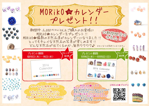 JUGEMテーマ:天然石アクセサリー 今年もやってきました! MORiKO★カレンダープレゼント! 第一弾★ビーズ編 10月1日(木)〜14日(水) 第二弾★原石編 11月4日(水)〜15日(日) 期間中、¥5000(税込)以上ご購入で、 MORiKO★ブログでおなじみ MORiKO★の美麗写真がつまった 数量限定!オリジナルカレンダーをプレゼント中! 毎年大人気のアイテムです! 早めになくなってしまうことも多いので、お早めに〜!!! 皆様こんにちは! 佐々木です...