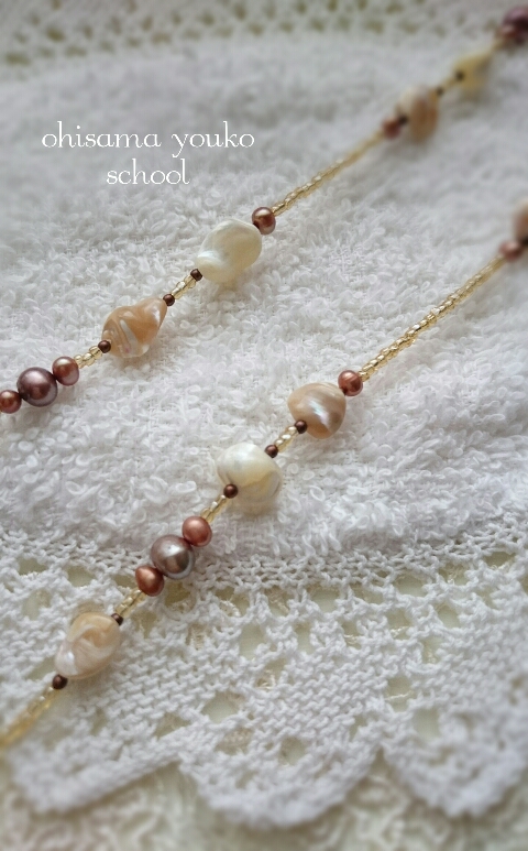 JUGEMテーマ:天然石アクセサリー 今日は アクセサリー教室。 ネックレスの基本 ビーズを通して 留める。 選んで頂いたビーズ☆ シェル & パール グラスビーズを間に入れながら……。 ロングネックレスを作られました。 少し秋色を入れながら…… ネックレスの出来上がりです。 :*:・(*^^*)・:*: 少しずつ 教室を再開していきたいな と思っています。 よろしくお願いします。