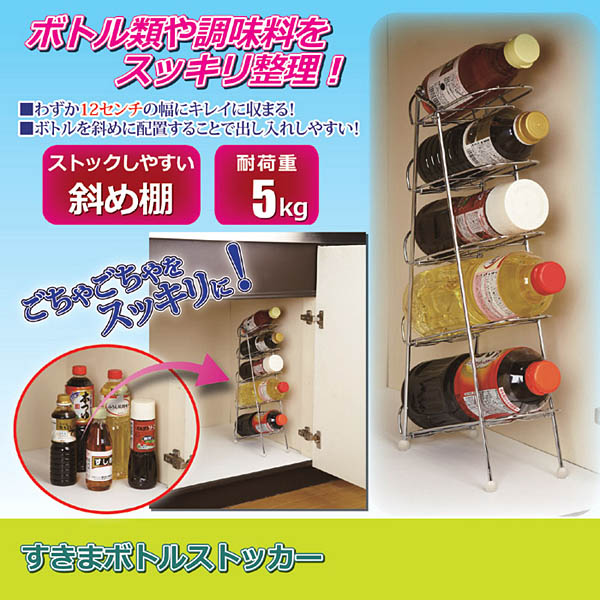 ボトルを斜めに配置することで出し入れしやすい。 斜め収納棚 ●ボトル類や調味料をスッキリ整理! ●わずか12センチの幅にキレイに収まる! ●ボトルを斜めに配置することで出し入れしやすい! サラダ油、しょうゆ、酢、みりんなど、キッチンではボトル調味料が多く、どうしても乱雑になりがちです。「すきまボトルストッカー」は、わずか幅12センチにボトル類を使いやすく収納するもの。シンク上はもちろん、シンク下での収納にもピッタリの5段棚タイプで、...