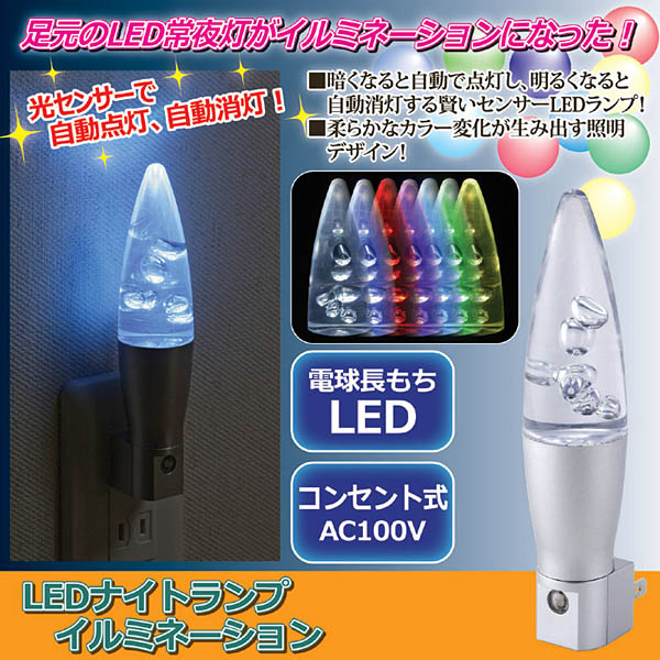 通路やお部屋の足元などに! 七色に優しく光るLEDライト/照明 ●足元のLED常夜灯がイルミネーションになった! ●暗くなると自動で点灯し、明るくなると自動消灯する賢いセンサーLEDランプ! ●柔らかなカラー変化が生み出す照明デザイン! コンセントに差し込んでおけば、夜間に照明を消した時にイルミネーションが光る。通路やお部屋の足元などにオススメで、明るすぎない光が優しく灯ります。色は七色に自然と変化を繰り返す仕...