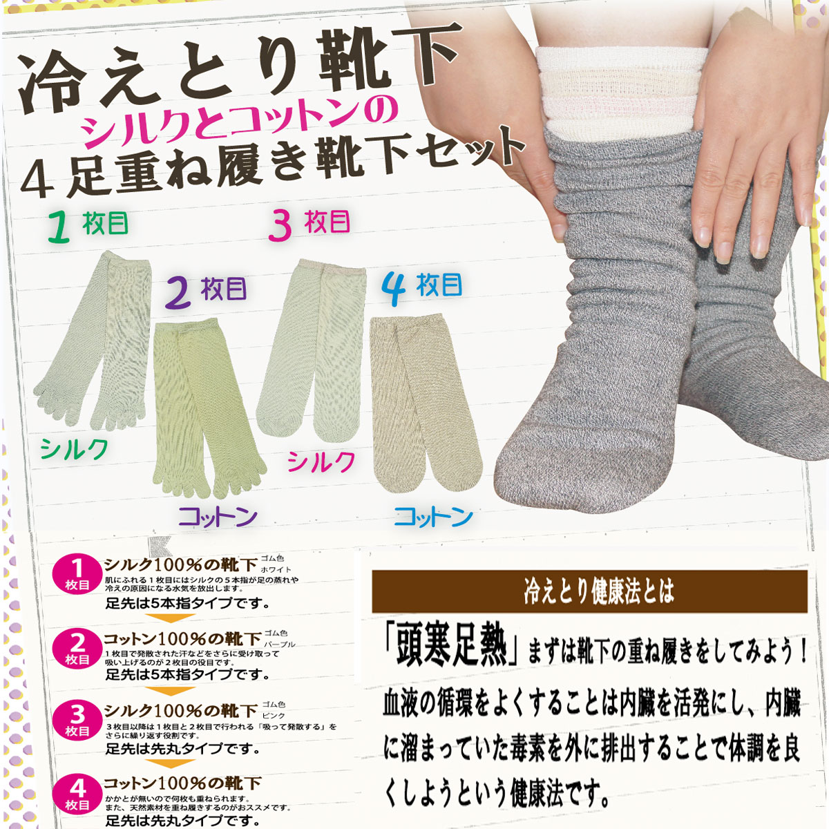 お待たせいたしました! 冷え取り靴下が、再入荷いたしました。 今年は、夏が終わったかと思うと、あっという間に秋になりましたね。 そこで、冷え取り靴下の製造が追いついていませんでしたが、 ここへきて、入荷をいたしました。 4枚重ね履きの本格 冷え取り靴下です。 人気の秘密は、デトックス効果もあるシルクセリシンという成分を含む、 天然繊維の絹糸を一枚目(肌に一番近い部分に履く) ここで、保湿機能、抗酸化作用があり、肌にとても良い事がはっきり分かった素材の5本指靴...