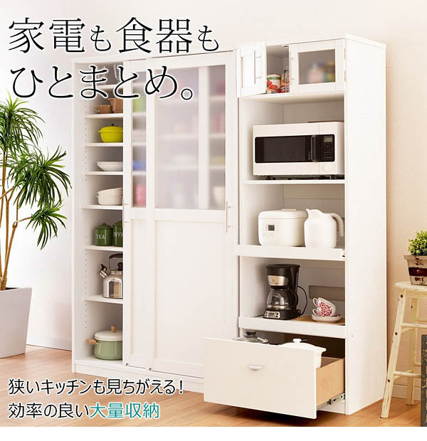 使い勝手の良い機能派キッチンキャビネット キッチンラック 調理器具や食器等をまとめて収納! お料理の作業効率を考えた動線とスペースを確保する、使い勝手のいい機能派収納シリーズです。 <Point> ● 上部までたっぷり収納! 棚の上部には普段は使わない大皿等の収納がオススメ。デッドスペースになりがちな上部を有効活用! ● 便利なスライドテーブル スライド式のテーブルを引き出せば、炊飯器やポットなどの蒸気を逃がせます。 ● 深い引き出しは楽々...