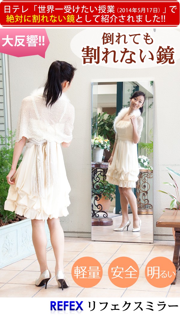軽くて絶対割れない鏡 反射率が高く、肌の色を忠実に映すのでメイクにもぴったり! 驚きの軽さ 移動、設置もらくらく くっきり鮮明に映る 業務用で長年使用されているプロ仕様のミラー 5mm厚のガラス鏡の約1/6と軽量です。市販のフックで簡単に壁に吊下げられます。女性や高齢の方でも手軽に部屋から部屋へ移動が出来ます。硝子ではなくフィルムですので落下したり衝撃を受けても割れたり飛散したりしないので安全です。厚みで映像がダブってしまうガラス鏡...