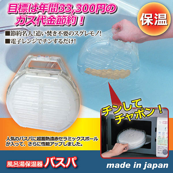 湯船のお湯の温度を長時間保温する画期的な商品 ●節約名人!追い焚き不要のスグレモノ! ●電子レンジでチンするだけ! 遠赤外線で体ポカポカ。お湯が長時間冷めないから、半身浴ものんび〜り。 湯船のお湯の温度を長時間保温する画期的な商品です。 本体を電子レンジで約10〜13分加熱してそのまま湯船の中に入れるだけで、約4〜6時間(お風呂の大きさ・温度によって前後します)お湯の温度を保温しつづけます。 家族の入浴時間がま...