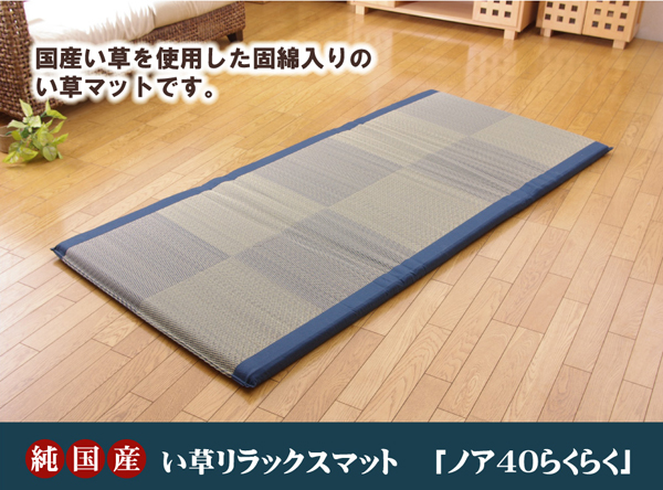 吸湿・抗菌・防臭効果で快適なごろ寝マット イ草 国産(九州産)のい草を使用したごろ寝マットです。 い草には 1.綿の約3倍の吸湿性があり汗のじめじめを軽減します。 2.湿度の調整作用があり、蒸れにくく快適な就寝を促します。 3.汗のにおいの元となる化学物質を90%以上抑え、においを軽減します。 などの効果があります。 中材にはクッション性にこだわり固わた40mmを使用していますので程良い弾力性があり、フローリングでも快適にご使用頂けます。青森ヒバ...