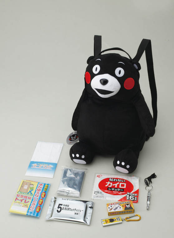 子供・女性向けの防災セットです。 販売価格:5,400円 お求めは KMR-A くまモンの非常持出しリュックセット(A) ■スペック ●商品サイズ:約400×260×240mm ●商品重量:約590g ●材質:リュック/ポリエステル ●仕様:くまモンのリュック(防災カード付)・くまモンのプチライト・防寒シート・マスク1枚・カイロ・ホイッスル・防災ウエット・緊急簡易トイレ ●JAN:4997747214066 (C)2010 熊本県くまモン ♯13723 子供・女性向けの防災セットです。