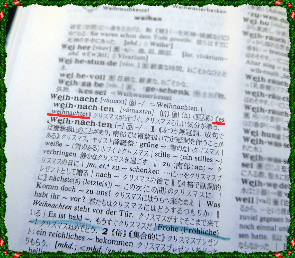 師走に入り、街中もクリスマスの雰囲気が一層濃くなってきましたね。 ドイツの各地でも、クリスマス市が始まり、にぎわっているようです。 関連記事を見ていたら、こんな表現!?といったものがありました。 それは Es weihnachtet. という2単語の文です。 「クリスマス」をドイツ語で「Weihnachten」といいますが、 これは名詞、 みかけた文では、その「クリスマス」が動詞で使われていたのです! 辞書を見てみると、ありました。 Es weihnachtet.で、 「...