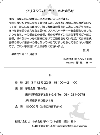 クリスマスカード【WC5010】Wカード 挨拶状デザインのクリスマスバーションです。文字だけの挨拶状ではなく、ちょっと飾りやワンポイントのイラストがあったらいいなぁ〜とお考えの方への「クラッシックデザイン」作成見本です。文章はオリジナル又は当店の文例をもとに作成致します。文字数によって、バランスを整えながら多少デザインを変える所も出てきます。校正確認でご確認いただいた後、印刷致します。年末のイベント招待状、クリスマスパーティー招待状、ご優待セール招待状、年末セールのご案内、クラブ会、懸賞当選通知...