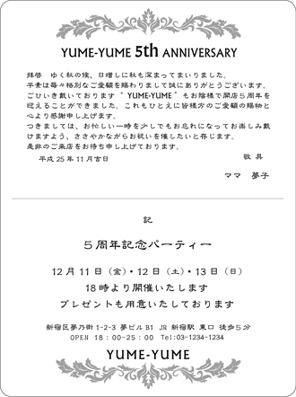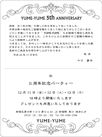 クラッシックデザイン【W2027】Wカード 文字だけの挨拶状ではなく、ちょっと飾りやワンポイントのイラストがあったらいいなぁ〜とお考えの方への「クラッシックデザイン」作成見本です。文章はオリジナル又は当店の文例をもとに作成致します。文字数によって、バランスを整えながら多少デザインを変える所も出てきます。校正確認でご確認いただいた後、印刷致します。お店の開店、周年記念、同窓会、クラブ会、懸賞当選通知、受賞祝賀会等の挨拶状、案内状、招待状に! 上下左右に飾りをお入れしました。飾りはグレーで作成して...