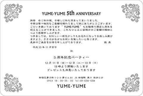 クラッシックデザイン【Y3029】単カード 文字だけの挨拶状ではなく、ちょっと飾りやワンポイントのイラストがあったらいいなぁ〜とお考えの方への「クラッシックデザイン」作成見本です。文章はオリジナル又は当店の文例をもとに作成致します。文字数によって、バランスを整えながら多少デザインを変える所も出てきます。校正確認でご確認いただいた後、印刷致します。お店の開店、周年記念、同窓会、クラブ会、懸賞当選通知、受賞祝賀会等の挨拶状、案内状、招待状に! 四隅に飾りをお入れしました。飾りはグレーで作成してい...