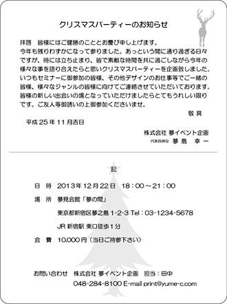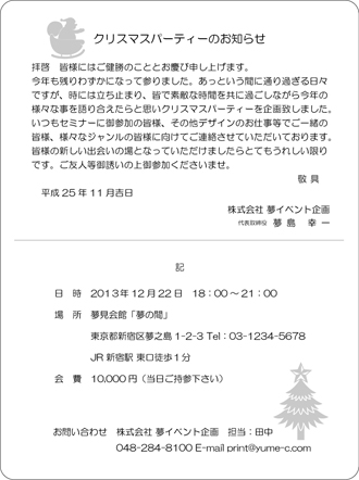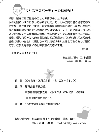 クリスマスカード【WC5001】Wカード 挨拶状デザインのクリスマスバーションです。文字だけの挨拶状ではなく、ちょっと飾りやワンポイントのイラストがあったらいいなぁ〜とお考えの方への「クラッシックデザイン」作成見本です。文章はオリジナル又は当店の文例をもとに作成致します。文字数によって、バランスを整えながら多少デザインを変える所も出てきます。校正確認でご確認いただいた後、印刷致します。年末のイベント招待状、クリスマスパーティー招待状、ご優待セール招待状、年末セールのご案内、クラブ会、懸賞当選通知...