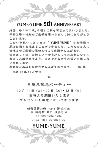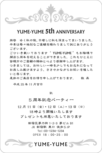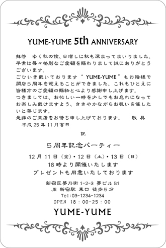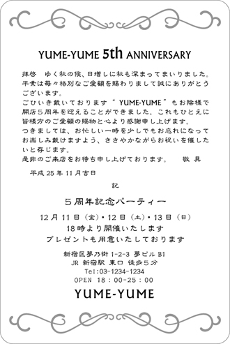クラッシックデザイン【T1019】単カード 文字だけの挨拶状ではなく、ちょっと飾りやワンポイントのイラストがあったらいいなぁ〜とお考えの方への「クラッシックデザイン」作成見本です。文章はオリジナル又は当店の文例をもとに作成致します。文字数によって、バランスを整えながら多少デザインを変える所も出てきます。校正確認でご確認いただいた後、印刷致します。お店の開店、周年記念、同窓会、クラブ会、懸賞当選通知、受賞祝賀会等の挨拶状、案内状、招待状に! 上下に飾りをお入れしました。飾りはグレーで作成しています...