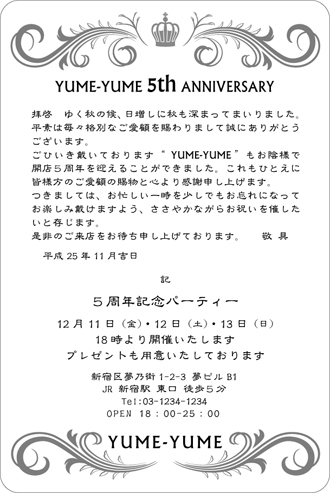 クラッシックデザイン【T1021】単カード 文字だけの挨拶状ではなく、ちょっと飾りやワンポイントのイラストがあったらいいなぁ〜とお考えの方への「クラッシックデザイン」作成見本です。文章はオリジナル又は当店の文例をもとに作成致します。文字数によって、バランスを整えながら多少デザインを変える所も出てきます。校正確認でご確認いただいた後、印刷致します。お店の開店、周年記念、同窓会、クラブ会、懸賞当選通知、受賞祝賀会等の挨拶状、案内状、招待状に! 上下にクラウンが入った飾りをお入れしました。飾りはグレー...