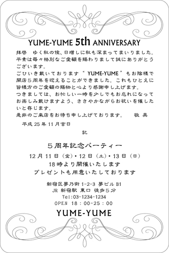 クラッシックデザイン【T1023】単カード 文字だけの挨拶状ではなく、ちょっと飾りやワンポイントのイラストがあったらいいなぁ〜とお考えの方への「クラッシックデザイン」作成見本です。文章はオリジナル又は当店の文例をもとに作成致します。文字数によって、バランスを整えながら多少デザインを変える所も出てきます。校正確認でご確認いただいた後、印刷致します。お店の開店、周年記念、同窓会、クラブ会、懸賞当選通知、受賞祝賀会等の挨拶状、案内状、招待状に! 上下にインパクトのある飾りをお入れしました。飾りは濃いめ...
