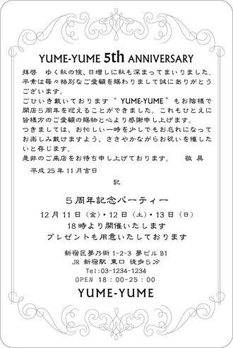 クラッシックデザイン【T1027】単カード 文字だけの挨拶状ではなく、ちょっと飾りやワンポイントのイラストがあったらいいなぁ〜とお考えの方への「クラッシックデザイン」作成見本です。文章はオリジナル又は当店の文例をもとに作成致します。文字数によって、バランスを整えながら多少デザインを変える所も出てきます。校正確認でご確認いただいた後、印刷致します。お店の開店、周年記念、同窓会、クラブ会、懸賞当選通知、受賞祝賀会等の挨拶状、案内状、招待状に! 飾り枠をお入れしました。お店のメニューの案内等でもよいか...