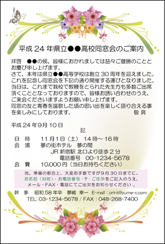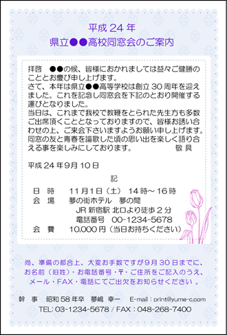同窓会はがきデザイン【hty_101】 ハガキサイズ:100×148? ピンクの花で華やかな感じでデザインしました。 ※文字は変更出来ます。 同窓会はがき文例【hty_101】 平成24年県立●●高校同窓会のご案内 拝啓 ●●の候、皆様におかれましては益々ご健勝のことと お慶び申し上げます。 さて、本年は県立●●高等学校は創立30周年を迎えました。 これを記念し同窓会を下記の通り開催する運びとなりました。 当日は、これまで我校で教鞭をとられた先生方も多数ご出席 頂くこととなっておりますので、皆様お誘い合わせのうえ、 ...