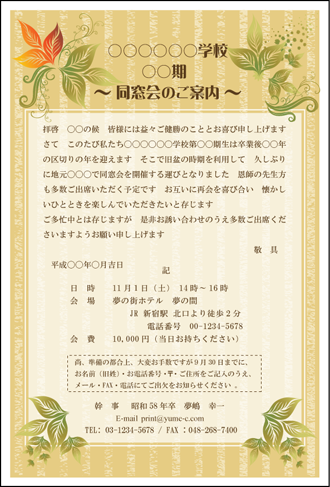 同窓会はがきデザイン【hty_104】 ハガキサイズ:100×148? パステルオレンジと肌色の間の色で、あわい感じで花デザインになっています。 ※文字は変更出来ます。 同窓会はがき文例【hty_101】と同じ文例です。 平成24年県立●●高校同窓会のご案内 拝啓 ●●の候、皆様におかれましては益々ご健勝のことと お慶び申し上げます。 さて、本年は県立●●高等学校は創立30周年を迎えました。 これを記念し同窓会を下記の通り開催する運びとなりました。 当日は、これまで我校で教鞭をとられた先生方も多数ご出席 頂くこととな...