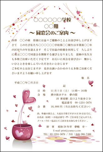 同窓会はがきデザイン【hty_107】 ハガキサイズ:100×148? ピンクのハートのデザインです。 ※文字は変更出来ます。 同窓会はがき文例【hty_101】と同じ文例です。 平成24年県立●●高校同窓会のご案内 拝啓 ●●の候、皆様におかれましては益々ご健勝のことと お慶び申し上げます。 さて、本年は県立●●高等学校は創立30周年を迎えました。 これを記念し同窓会を下記の通り開催する運びとなりました。 当日は、これまで我校で教鞭をとられた先生方も多数ご出席 頂くこととなっておりますので、皆様お誘い合わせのうえ、...