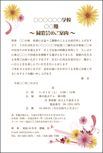 同窓会はがきデザイン【hty_108】 ハガキサイズ:100×148? 黄色とピンクの花を上下にデザインしました。主体は白でシンプルです。 ※文字は変更出来ます。 同窓会はがき文例【hty_101】と同じ文例です。 平成24年県立●●高校同窓会のご案内 拝啓 ●●の候、皆様におかれましては益々ご健勝のことと お慶び申し上げます。 さて、本年は県立●●高等学校は創立30周年を迎えました。 これを記念し同窓会を下記の通り開催する運びとなりました。 当日は、これまで我校で教鞭をとられた先生方も多数ご出席 頂くこととなってお...