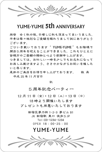 クラッシックデザイン【T1016】単カード 文字だけの挨拶状ではなく、ちょっと飾りやワンポイントのイラストがあったらいいなぁ〜とお考えの方への「クラッシックデザイン」作成見本です。文章はオリジナル又は当店の文例をもとに作成致します。文字数によって、バランスを整えながら多少デザインを変える所も出てきます。校正確認でご確認いただいた後、印刷致します。お店の開店、周年記念、同窓会、クラブ会、懸賞当選通知、受賞祝賀会等の挨拶状、案内状、招待状に! 四隅のコーナーに飾りをお入れしました。飾り部分はグレーで...