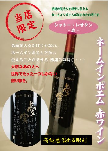 お父さんがワイン好きならば、おすすめしたいのが、 こちらの、ネームインポエムの赤ワインです。 名前の通りもちろんお父様のお名前を入れることができますが、 それだけではなく、感謝の気持ちもメッセージとして彫刻することができます。 このメッセージをひとつひとつ手作りで彫刻していくので、 世界でただ一つの、気持ちのこもったプレゼントとなりますね♪ また、こちらのオリジナル父の日ギフトですが、 以下のようなラッピングをしてくれます。...
