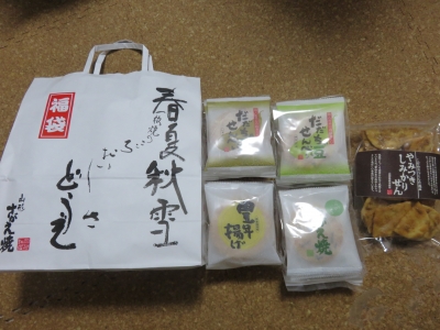 JUGEMテーマ:福袋 さがえ屋福袋1080円 横浜タカシマヤの銘菓百選で販売されていた福袋です。 以前友達から頂いてとてもおいしいお煎餅だったので購入してみました。 特にやみつきしみかりせんに関しては公式通販で1週間待ちの商品なので、偶然購入出来てうれしいです。 福袋の中身は公開されていませんでしたが、隙間から見た限りではすべて同じ物のようでした。 (参考:http://www.sagaeya.co.jp/) 内容 やみつきしみかりせん 573円 だだちゃ豆煎餅4枚(サラダ味)184円 だだち...