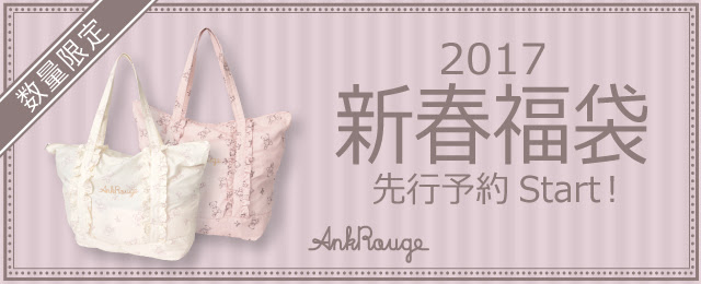 JUGEMテーマ:福袋 じゃじゃん!! 毎年買っているAnkrougeの新春福袋。 2017年の福袋は11月16日(水)WEB予約スタートでしたので 待ちに待って…予約完了しました〜〜☆! 本当にほしいのとかは、予約したが確実だからね(´・ω・`) 初売りに早起きして、若い子たちに紛れて並んで イケイケ〜〜〜〜って感じで買うのはきついっすわ お婆は茶でも啜りながら、こたつの中で福袋が到着するのを待っとるのが一番(方言もろばれw) そもそも今年は疲れすぎ...