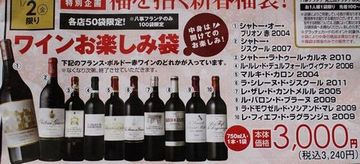 JUGEMテーマ:福袋 2015年 明けましておめでとうございます。 旧年中は色々お問い合わせもいただきありがとうございました。 本年もワインブログをよろしくお願いします。 さて毎年お正月恒例のボルドーワインお楽しみ袋、 と言ってもわたしの企画ではなく、 近所のスーパーマーケットでの催しですが、 今年は昨年より内容が良さそうです。 3,240円でオーブリオンやジスクール他にも… 説明するのが大変なのでチラシを掲載しておきます。 どうですか? 私としては2009年産も多く、はずれが少ない...