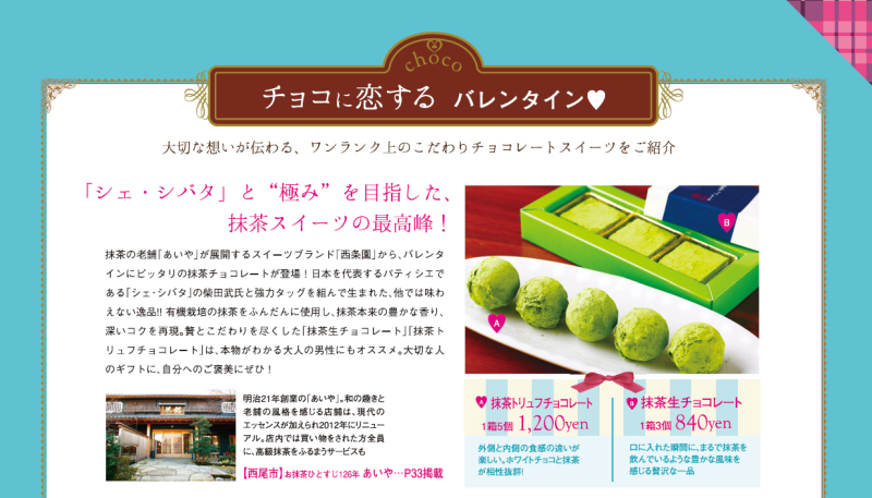 CHAOO西三河版 2月号(1/15発行)に あいやのトリュフチョコレート、 生チョコレートの記事が載りました。 特別な人には特別なチョコレートを! 詳しくは記事をご覧ください(本誌では28Pです)。
