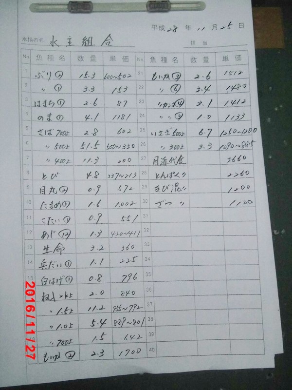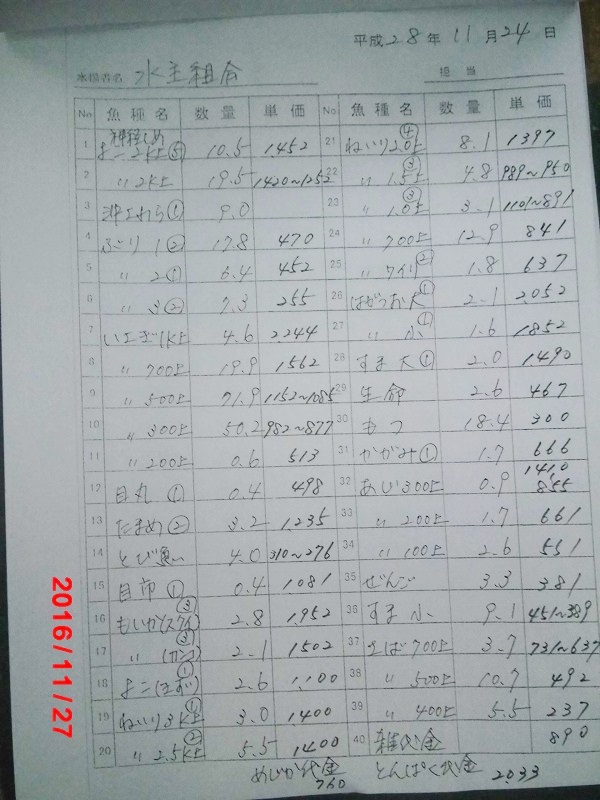 古満目漁協落札価格 | 2016.11.28 Mon 04:28
